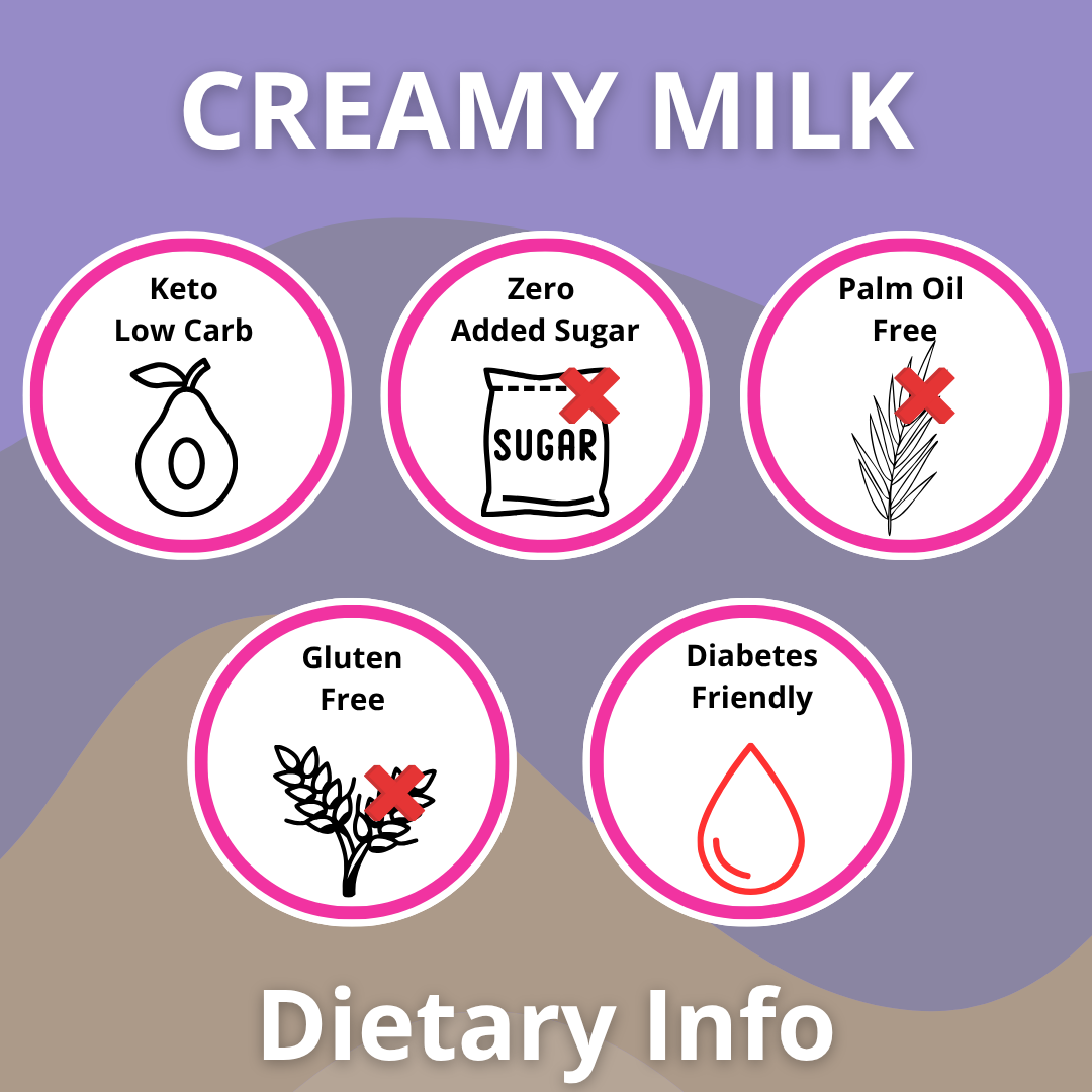 INGREDIENTS: Cocoa Butter, Cocoa mass, Milk Powder (Milk), Soluble Fibre: Inulin, Erythritol, Whey Powder (Milk), Cream Powder (Milk), Steviol Glycosides, Salt.