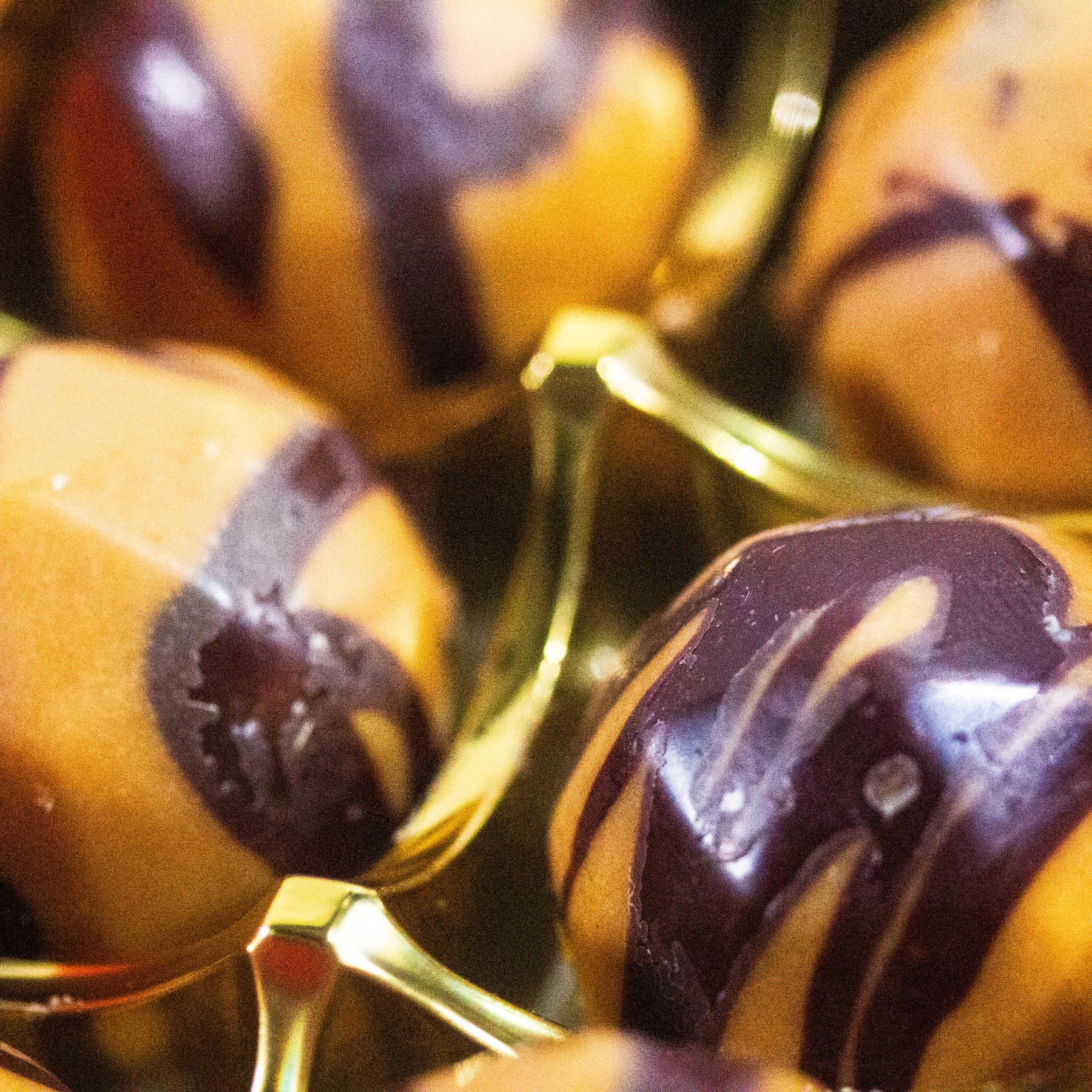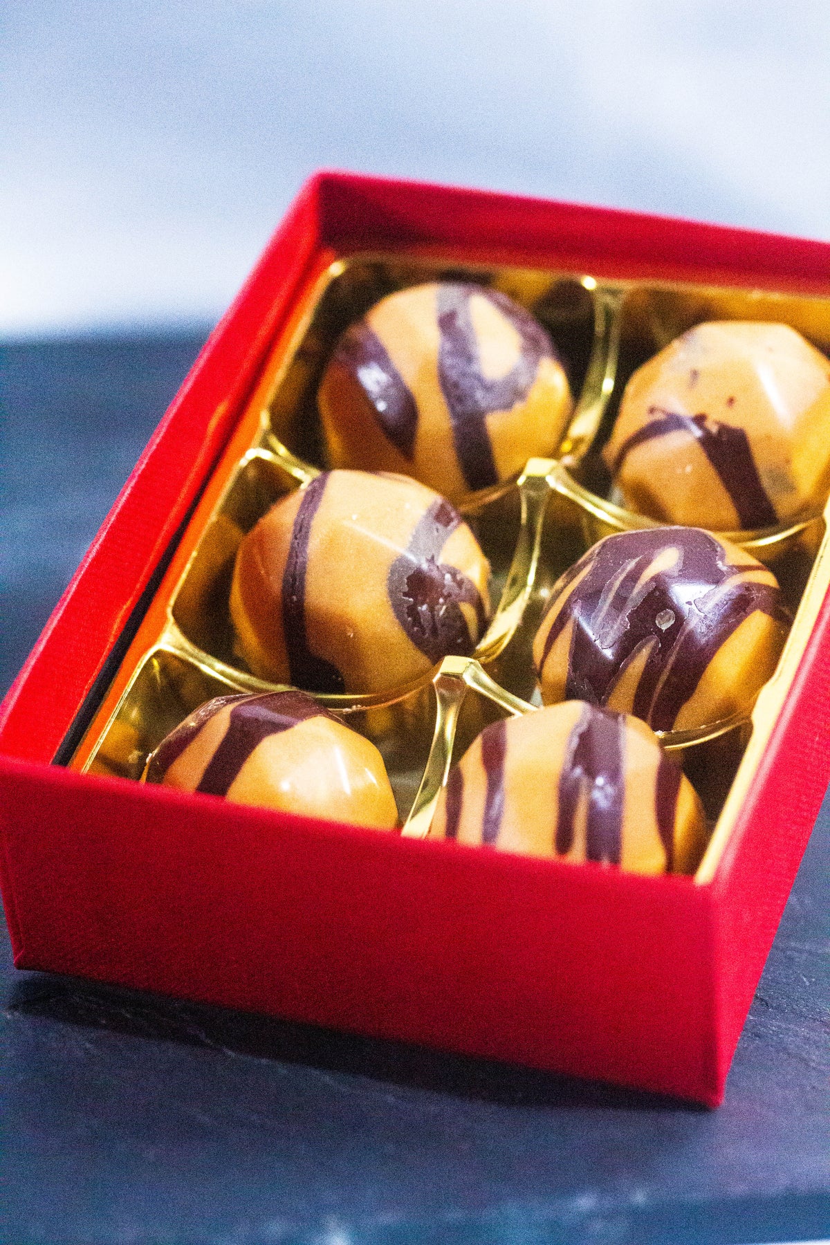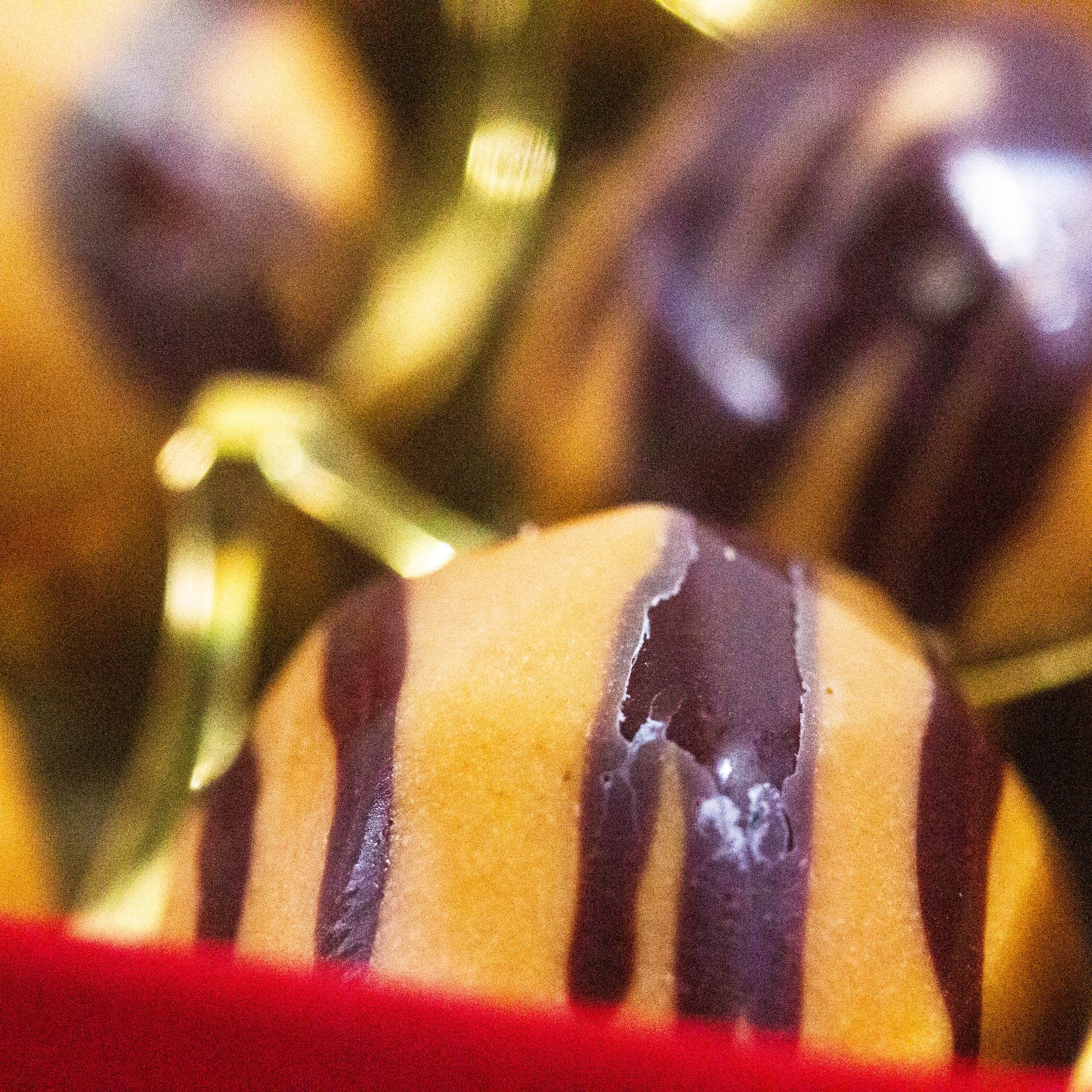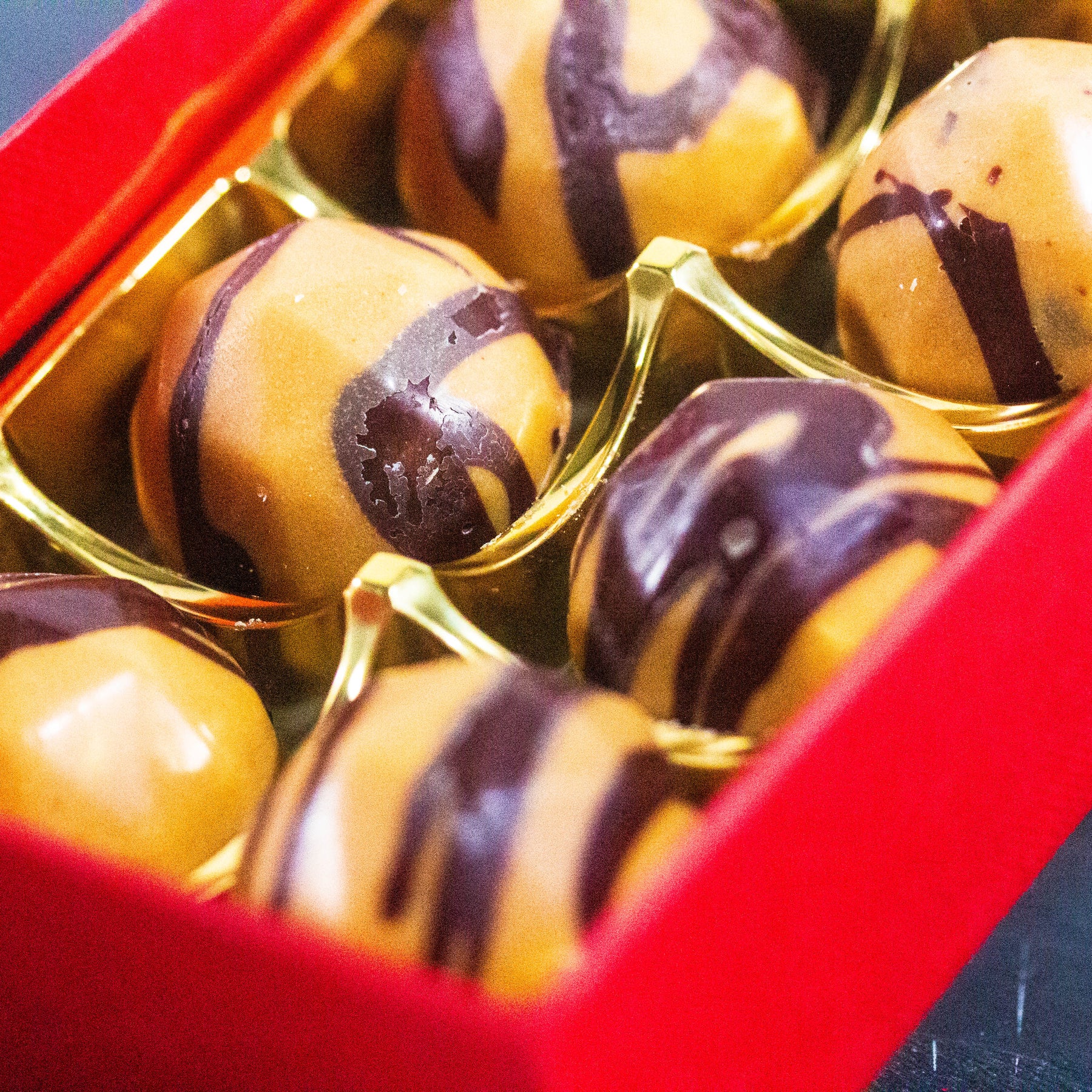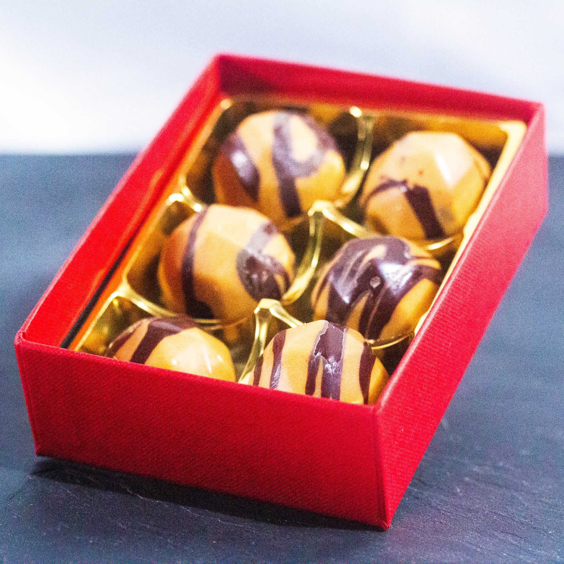 Gold chocolate with dark lines makes these decadent with caramel creamed notes.Ā
