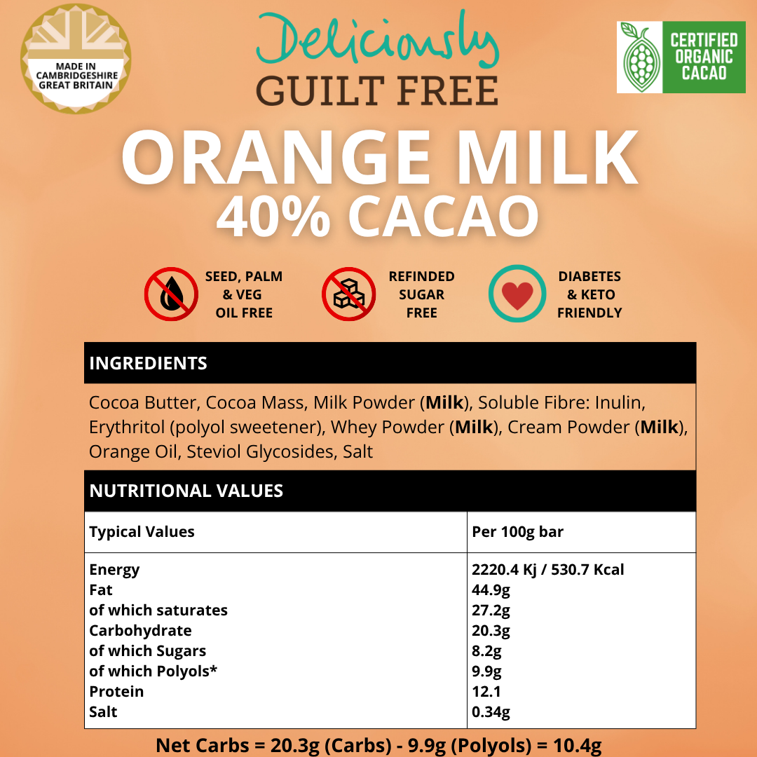 INGREDIENTS: Cocoa Butter, Cocoa mass, Milk Powder (Milk), Soluble Fibre: Inulin, Erythritol, Whey Powder (Milk), Cream Powder (Milk), Orange Oil, Steviol Glycosides, Salt.